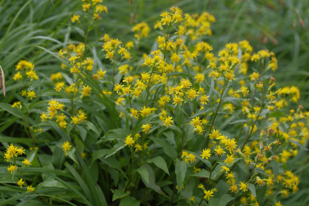 ミヤマアキノキリンソウ 交通;名古屋方面からだと飛騨清見インター経由、東京方面からだと松本インター・安房トンネル経由ほおのき平スキー場に駐車しシャトルバスで乗鞍スカイラインを畳平迄行く。所要時間は約45分。 乗鞍岳へのアクセスマップ参考コース;畳平から木道のあるお花畑に少し下り、不消ヶ池の手前を左へ登り広い登山道ヘ合流する。しばらく行くとコロナ観測所方面と肩の小屋方面への分岐にでる。左、肩の小屋方面ヘ行く。畳平から肩の小屋迄ゆっくり花の写真を撮りながら行っても1時間半くらい。肩の小屋近くには公衆トイレがある。肩の小屋から剣ヶ峰への登山道は整備されているがガレ場的な石で足下に注意が必要。特に下りで雨の日は滑り易い。肩の小屋からは少し急登となる。肩の小屋からの急登をあえぎながら行くと権現池の見える鞍部に着く。コロナ観測所や山頂も見え最高の景観である。一息入れ、最後の山頂迄は頂上小屋ルートと直登ルートどちらでほぼ同じ時間で着く。ゆっくり行っても肩の小屋から山頂迄1時間半くらい。下りも同じルートを戻る。山頂から畳平迄ゆっくり行っても2時間半くらい。お天気がよければ白山や穂高連峰等も見える。